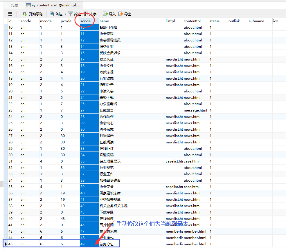 解決辦法用數(shù)據(jù)庫(kù)管理工具打開(kāi)數(shù)據(jù)庫(kù),找到欄目表ay_content_sort,打開(kāi)把最后一行數(shù)據(jù)對(duì)應(yīng)的scode列的值改成當(dāng)前···